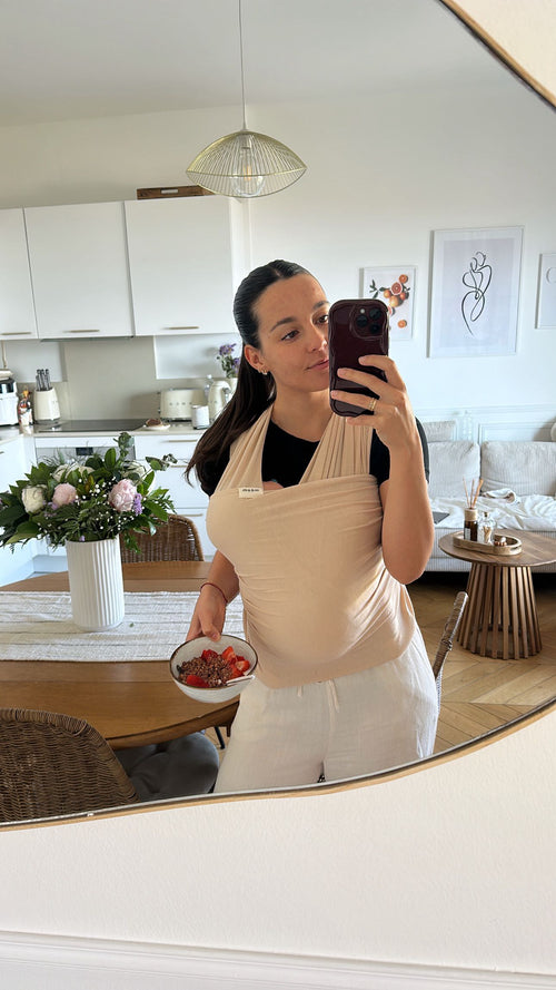Portez votre bébé les mains libres avec style. Vous donnant la liberté de continuer à faire ce que vous aimez, tout en gardant le contact peau à peau avec votre bébé pour favoriser les liens.